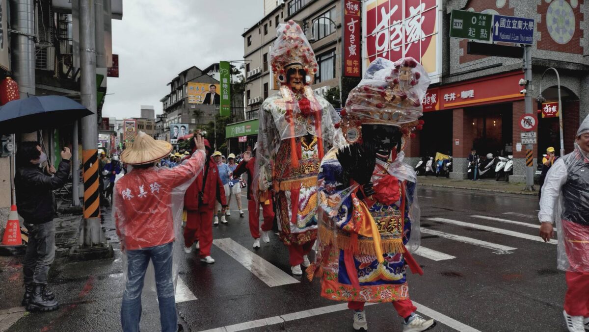 ▲宜蘭市長陳美玲戴斗笠向行進的大神尪等陣頭揮手致意。