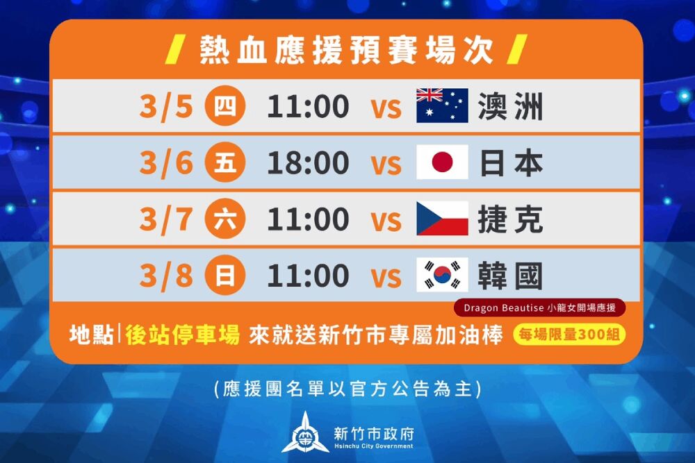 新竹市WBC直播派對賽事時間為:3月5日上午11時中華隊對澳洲、3月6日晚間6時中華隊對日本、3月7日上午11時中華隊對捷克,以及3月8日上午11時中華隊對韓國,活動地點皆為新竹市後站停車場。