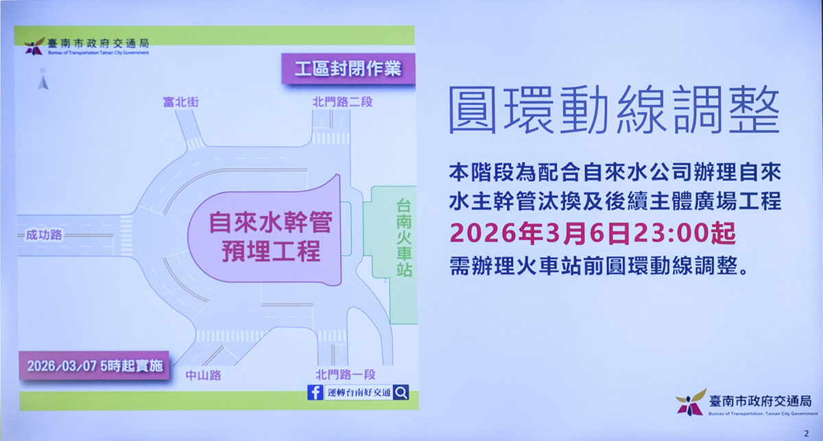 交通局長王銘德表示,站前圓環改造是本市重大工程之一,由於站前圓環是市區交通樞紐,市長黃偉哲已指示交通局務必做好交通規劃,確保工程順利推進,並減少施工期間對民眾影響,日前第一階段已請工務局、自來水公司針對既有圓環分隔島、植栽移除及汰換老舊自來水管線先行作業,本次第二階段即將進入自來水主幹管汰換及主體廣場工程,預訂於115年3月6日(五)夜間11時起進場施工,並將會更動現有圓環行車動線。
