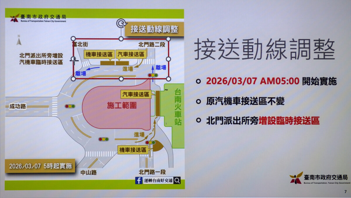 本階段台南火車站前站之汽、機車臨時接送區維持現有地點,另為疏散停等車輛,3月7日起新增於圓環北側(近北門派出所路段)增設汽、機車接送區,請依牌面指示臨停,不得久佔,同時呼籲民眾多加使用後站接送分流。