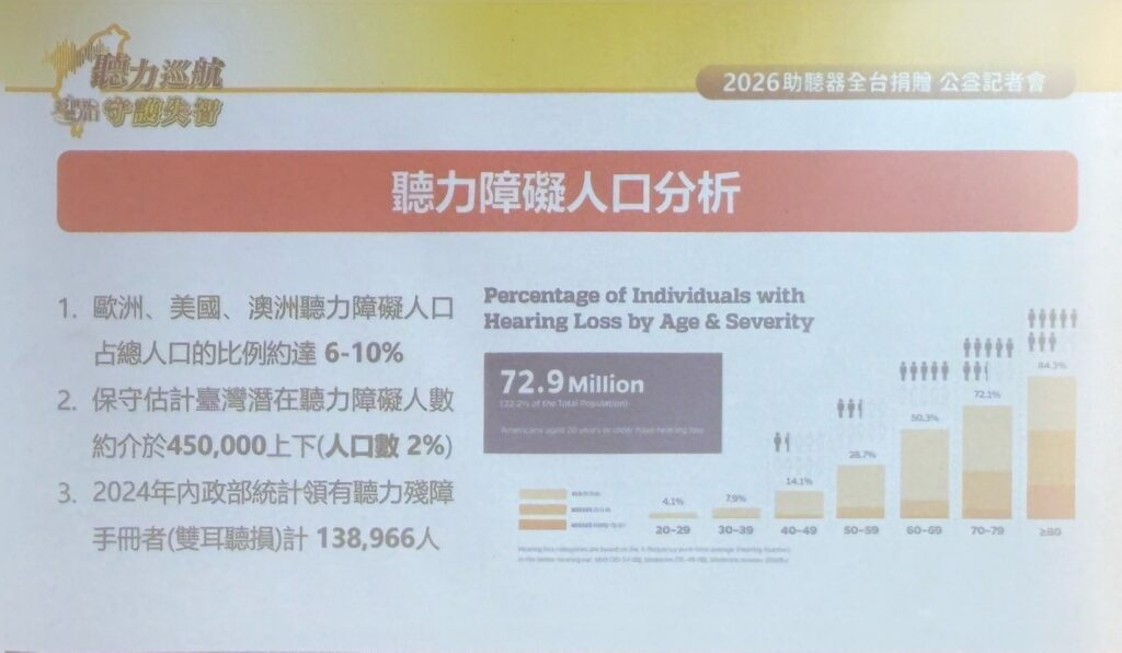 資料顯示聽力損失人口比例會隨年齡增加而上升。趙偉傑醫師推估台灣潛在輕中度聽力損失人口可能達40至50萬人,遠高於目前領取聽障證明的13萬人。研究指出輕度聽損者失智風險即提高至2倍以上,凸顯早期篩檢與介入的重要性。