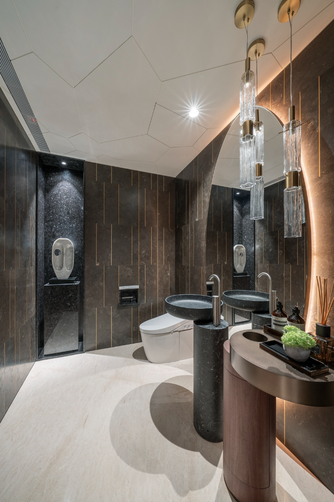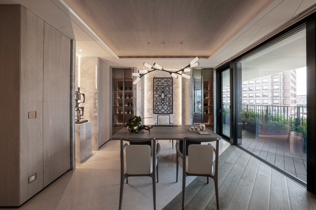 設計以居者生活為核心,公私區域明確分工且靈活串聯。玄關兼具迎賓與交誼功能,藝廊餐廳、客廳與茶室形成多層次社交場域,滿足多種情境需求。臥室、衛浴與更衣室注重舒適與私密,八字形浴室布局延伸景觀視野。移動家具與電動門使空間自由調整,實現居住的便利、舒適與儀式感,將豪宅體驗極致化。