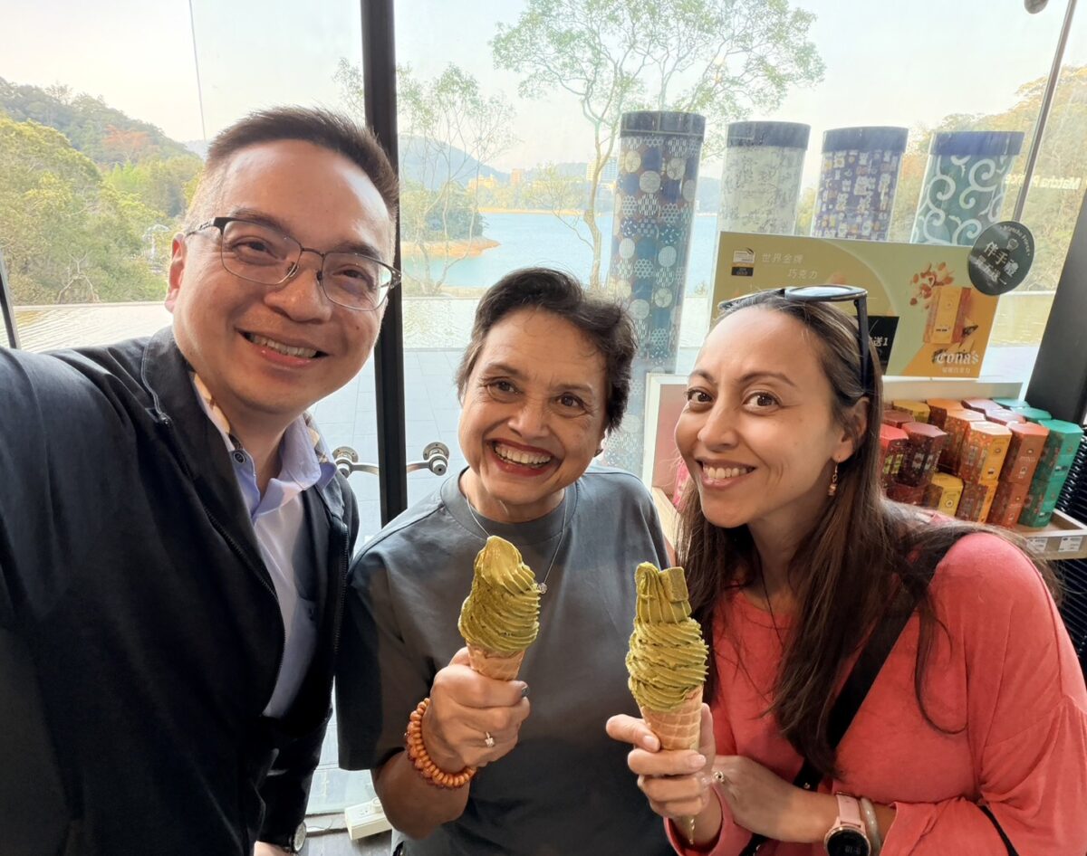 ▲王智益處長陪同關島總督品嚐茶茶小王子抹茶霜淇淋。
