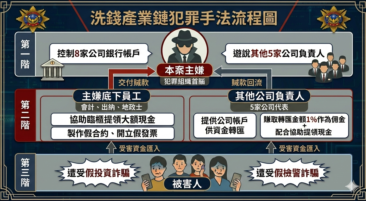 專案小組經溯源發現,蔡嫌主嫌另聘請黃姓會計師設置公司內帳,並聘請張姓出納以相關公司帳戶開立假發票洗錢,擴大清查涉詐帳戶達88個,詐騙總金額高達5億8790 萬元;警方於115年1月份發動第二波拘搜行動,其中包含6位公司負責人,經深入瞭解,蔡嫌遊說其他公司負責人提供公司帳戶,除可以抽取千分之1佣金以外,並可美化公司金流以利申請企業貸款,透過開立不實發票及製作假合約誘騙銀行放行大額金流,讓其他公司金融帳戶成為蔡嫌的洗錢產業鏈,經統計共有14家公司銀行帳戶在蔡嫌掌控下參與洗錢。