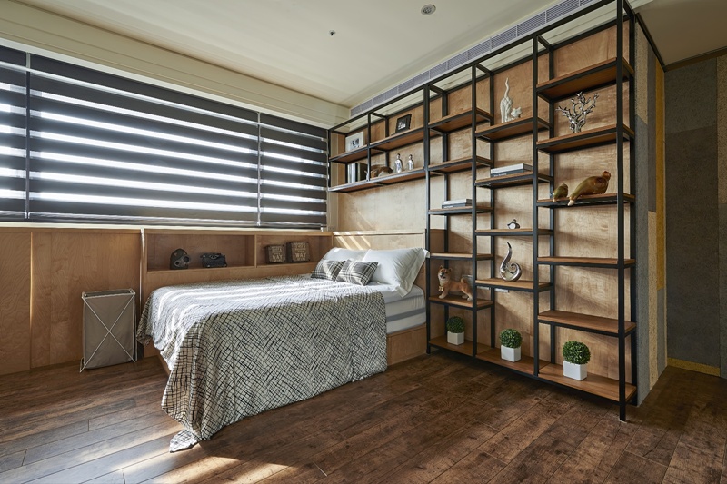 - 木鐵交構:次臥以黑鐵層架結合木質櫃體,收納與展示並存,營造俐落而沉穩的個人調性。