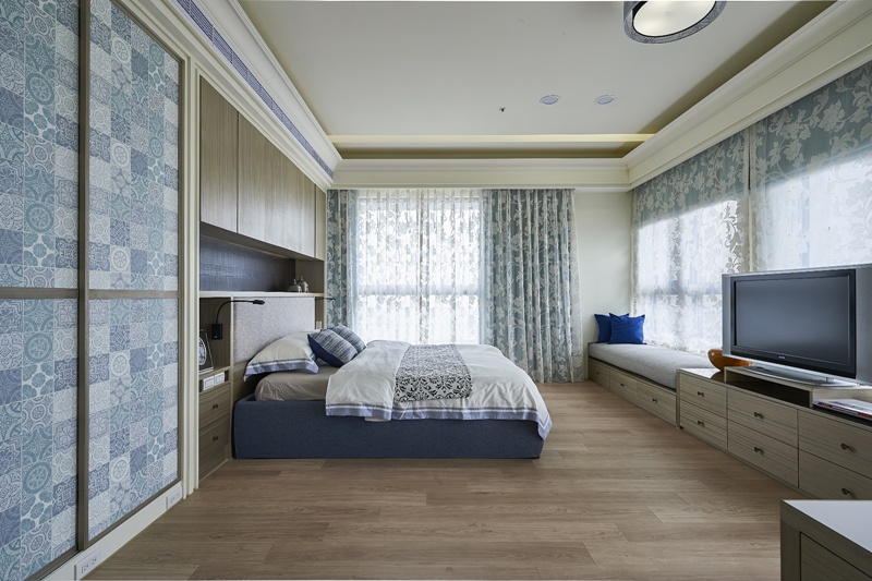 - 藍調層次:主臥以淺色木櫃與藍紋交織壁紙對比,形塑柔和而富層次的休憩氛圍。