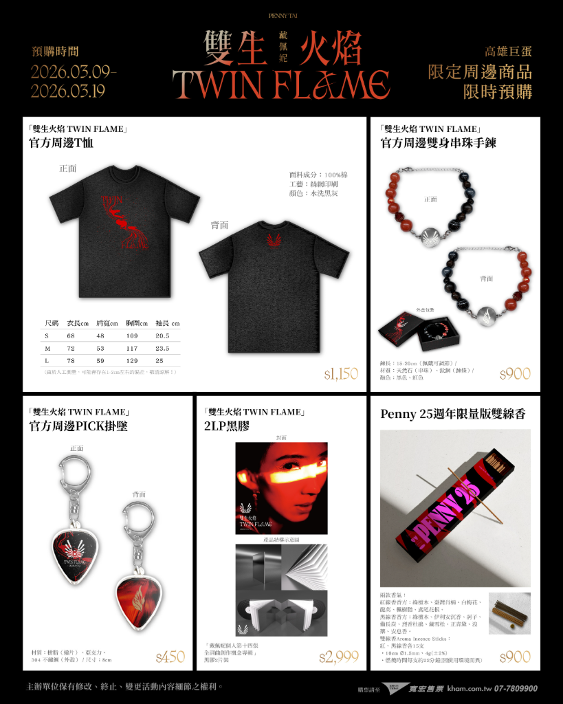 其中最受矚目的,莫過將於高雄最終場,首賣推出的限定商品——「Penny 25週年限量版雙線香」,特別攜手「設計師的仙界傳說」設計師Misc共同打造,將氣味創作與音樂情感相互結合,透過專屬調香與包裝設計,延伸《雙生火焰》關於靈魂、陪伴與時間流轉的概念。讓歌迷能以另一種感官方式收藏這段音樂記憶。