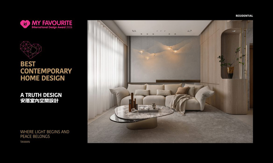 My Favourite International Design Award(MFID)作為馬來西亞首個且唯一的國際設計獎項,2026年由橫跨11國16位專業評審,以含括設計理念、美學表現力、功能性、永續實踐、文化脈絡等五大標準嚴格遴選,致力於發掘並推廣兼具精湛工藝與前瞻創意的優秀作品。安厝設計 主持設計師 王怡涵、設計師 方繹杉 於作品《曙燁光宸》中,面對成年子女各異的生活風格與情感需求,在世代喜好間巧妙取得平衡,使每一處空間既保有居者的獨特個性,又凝聚家人之間溫柔而深刻的情感連結,於日常起居中營造悠然自在的度假氛圍,充分體現MFID之核心精神,榮獲住宅空間類「Winner」殊榮!