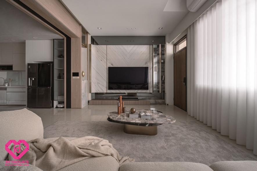 ▲客廳以香檳金髮絲紋鍍鈦飾條串連,與燈飾的金光呼應,灰鏡電視牆收尾,打造如度假飯店般精緻場域,將屋主對悠閒優雅的生活想像精準具現。