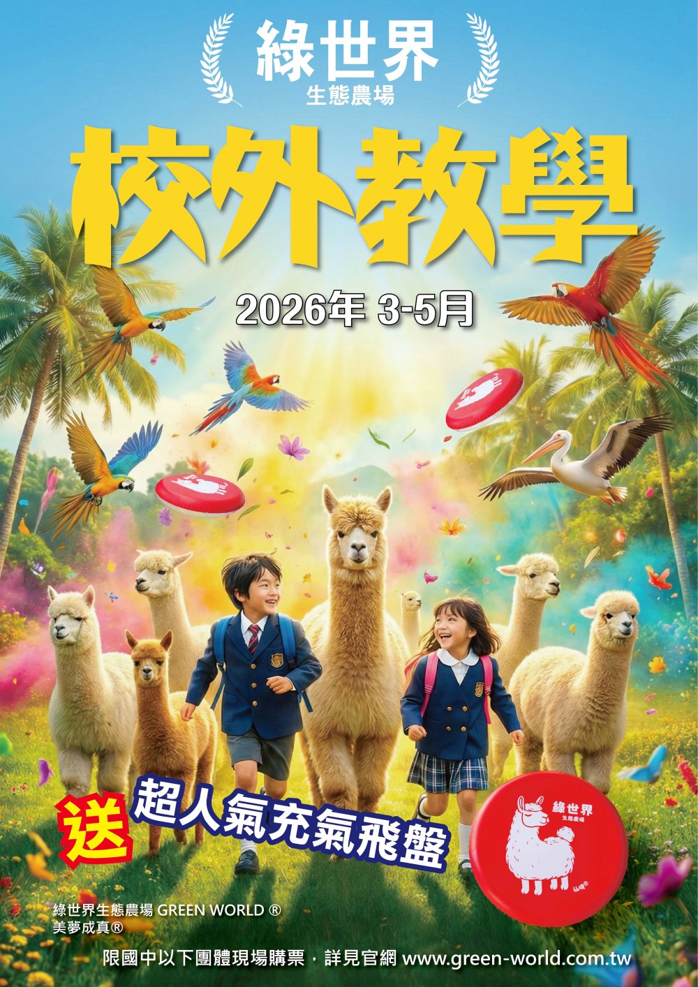 春暖花開,正是帶孩子們走出教室、親近大自然的好時機!知名生態景點「綠世界生態農場」即日起推出2026春季校外教學專屬活動。只要在3月至5月期間來園區舉辦校外教學,國中以下的師生不僅能享有特別優惠價,還能把超萌的「超人氣充氣飛盤」免費帶回家!