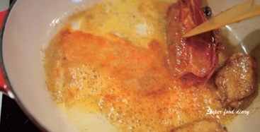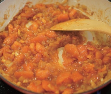 Step3.同鍋續以中小火炒香蒜末、洋蔥丁、紅椒粉後,轉中火下番茄塊、番茄紅醬、番紅花炒至番茄成糊狀。烤箱預熱至200℃。