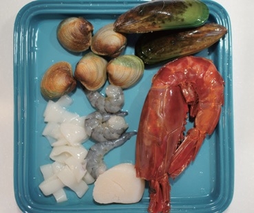 Step1.將雞翼或雞腿以分量外的紅椒粉及鹽抓醃,靜置20 分鐘。蝦開背去腸泥,將蝦頭與蝦身分開, 其他海鮮均洗淨。牛番茄去皮切塊。再準備1