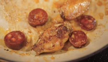 Step2.鍋內以中火熱橄欖油,將雞翼二面煎到焦香,再續下蝦頭煎出蝦膏(可用鍋鏟稍微壓蝦頭擠出膏)後,將蝦頭取出備用,再下臘腸煎香。