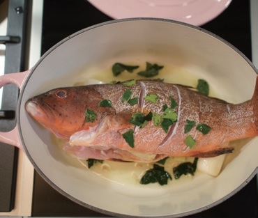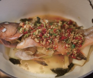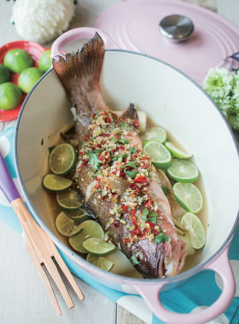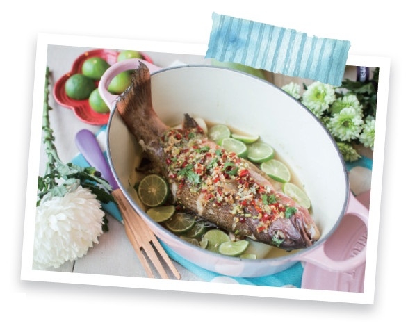 以少量的青檸汁替代整鍋的滾水來蒸魚,不僅魚肉充滿泰菜的清香,青檸汁更可中和鮮魚流出的汁液,減少魚腥味,成為鮮美又帶酸甜的下飯醬汁。在橢圓鍋內墊上北京大蔥,魚就不會沉在鍋底,在餐桌上也很美觀喔。