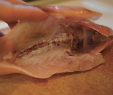 Step1.魚身內血塊是腥味主要來源, 故先需將魚肚剖開裡的暗紅血塊儘量清洗及刮出, 減少魚腥味。