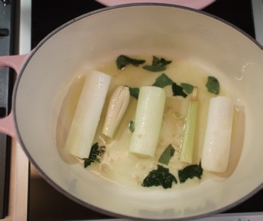 Step3.橢圓鍋裡平均鋪上北京大蔥及香茅段(可以普通蔥白段替代),撒上剩下的撕碎檸檬葉。鍋內並倒入2 顆青檸擠出的青檸汁。