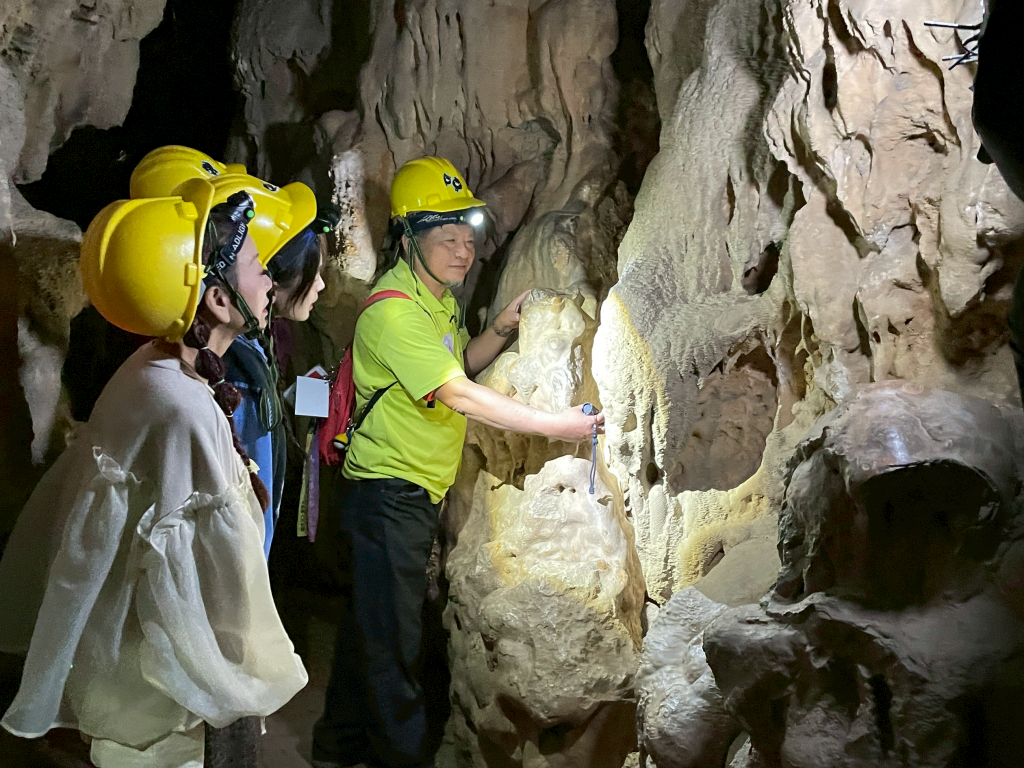 經過長達半小時的攀爬,眾人終於抵達目的地-猩猩洞!在職人的帶領下抵達地下鐘乳石洞穴,一進入就讓眾人震撼大自然的鬼斧神工,鐘乳石大約一千年才能生長出一公分的高度,要長到成人高度需要長達十幾萬年的歲月,如果輕易碰觸正在生長的鐘乳石,就直接去掉50年的成長高度!所以絕對不要亂碰。接著繼續往異世界深處探險,職人介紹大猩猩就在眼前!原來是高達120公分,看起來像是猩猩的鐘乳石,是大自然雕刻12萬年的作品。
