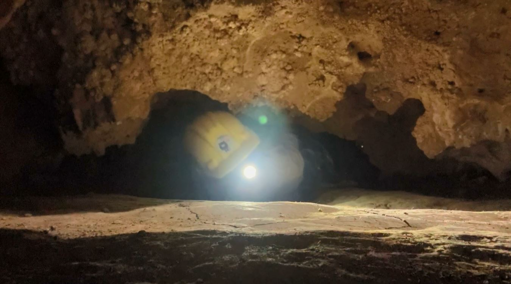 ▲ 阿翔鑽壽山鐘乳石洞滿頭汗,直呼像「從媽媽肚子出生」。(圖:民視)