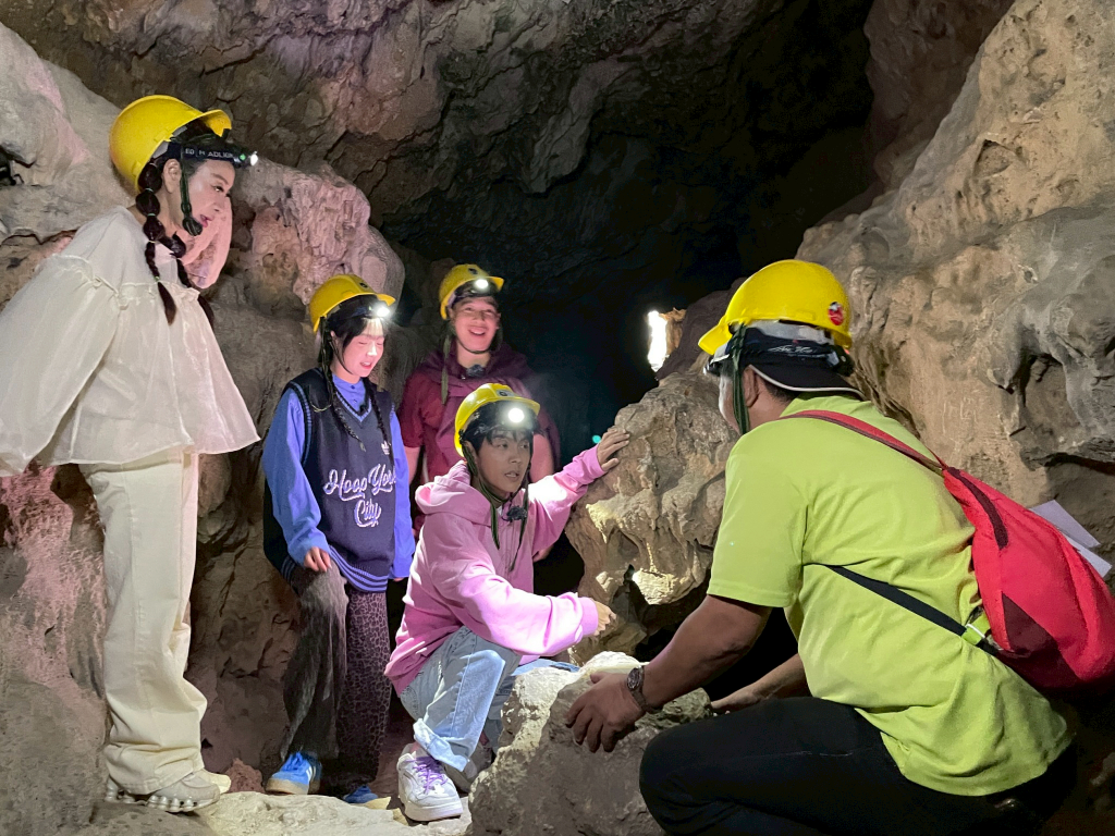 接著職人說還有個異世界秘境關卡,讓大家感受一下。眾人看著需要蹲著才能勉強進入的洞穴,詢問這真的能通過嗎?最終推出全場最瘦的阿翔率先出發,阿翔奮力的壓低身形往前走,發現前方的路相當狹小,甚至需要靠匍匐才能勉強前行,吃力的往前爬,職人在終點處亮燈,原來匍匐的盡頭處可以站起,在兩面狹窄的鐘乳石壁中有個狹窄的出口,需要靠著側身協調奮力鑽出,阿翔使出吃奶的力氣出力,滿頭大汗狼狽的探頭,直呼好像從媽媽肚子裡生出來的感覺。