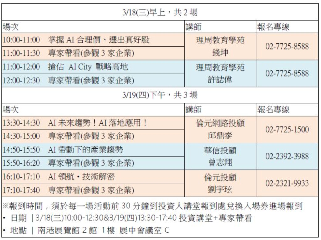 本活動最具震撼力的創新在於「專家帶看」環節。在每場講座結束後,將由各老師領隊走進展覽核心,直接前往台達電、東元、台灣大哥大、新光保全、關貿等相關企業攤位參觀。投資人將能親眼看見AI如何應用於智慧電力、工業自動化與雲端系統,將老師口中的「趨勢」轉化為雙眼所見的「實績」。