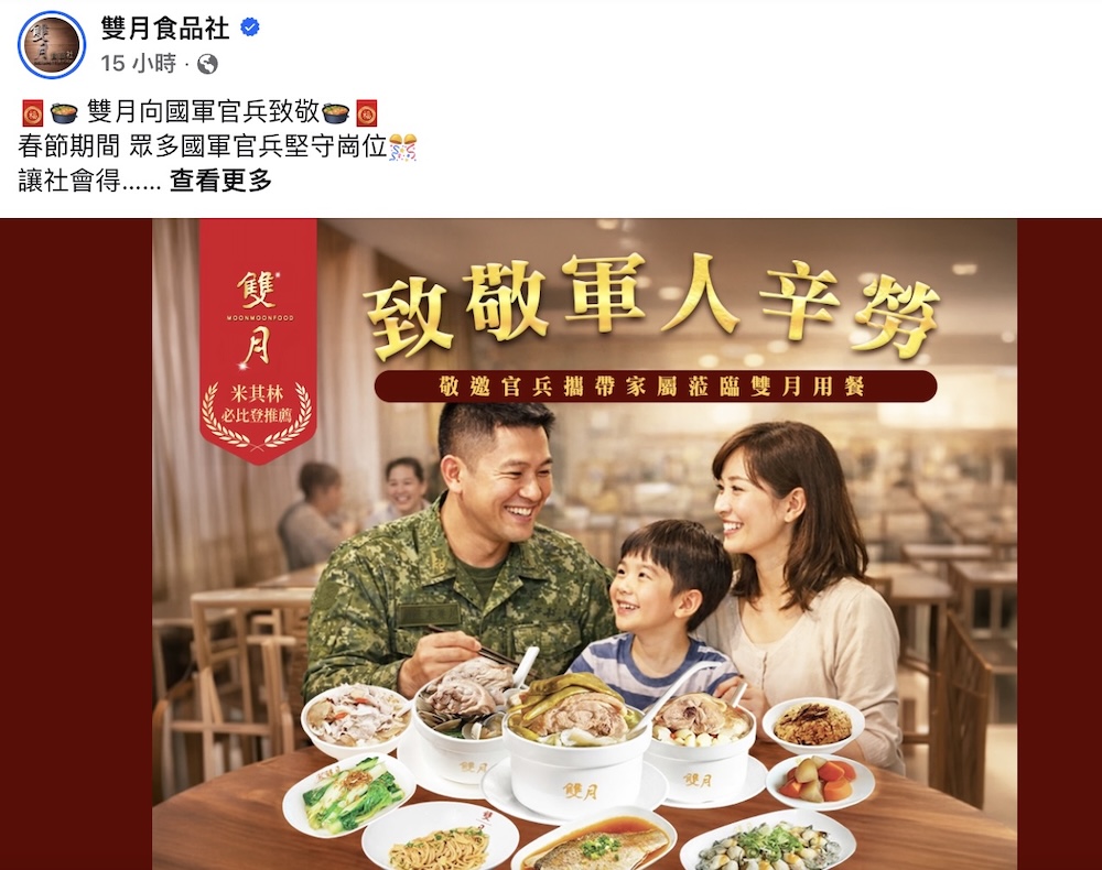 為向春節期間堅守崗位、守護社會安定的國軍官兵致敬,雙月食品社將於3月21日舉辦「愛軍團聚活動」,開放現役官兵攜家屬到全台五家門市共餐,以年節後的一桌熱食,向默默守護台灣的國軍表達謝意與敬意。雙月表示,希望透過這次活動延續年節溫情,讓更多民眾看見國軍在戰備與各項勤務上的付出,也讓官兵與家人能在營區之外,享有難得的團聚時光。