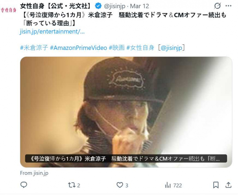 另一方面,去年10月曾有媒體報導米倉涼子與交往中的阿根廷舞者男友受到調查關注,調查一度延伸至她的住處。不過最終未發現她涉及違法藥物使用,案件也以不起訴結案。報導也指出,該名阿根廷舞者去年離開日本後便未再返回,兩人逐漸失去聯繫,戀情被指已經告一段落。