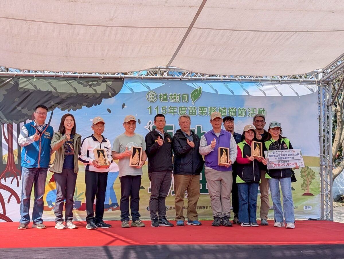 今日活動,由縣府頒發苗栗縣綠化有功人士及團體,新竹分署也頒發參與114年度「社區林業」計畫成果優異的苗栗地區績優社區,展現公私協力守護山林的豐碩成果。鍾縣長對獲獎單位表達高度敬意與感謝,認為這些基層夥伴是讓苗栗成為幸福宜居城市的關鍵力量,榮獲「特優」的「苗栗縣賽夏族原住民林業暨勞動合作社」,自108年組織「南庄森力軍」巡守隊,守護加里山傳統領域,114年更建置森林小站通報系統,實踐部落與森林共榮願景。榮獲「優等」的「頭屋鄉明德社區發展協會」,成功品牌化林下經濟產品,並培訓觀察員利用科技記錄到一級保育類食蛇龜蹤跡,將里山精神落實於生活;同獲「優等」的「樂活通霄休閒農業發展協會」則深耕森林療癒,培育專業療癒師並串連企業力量,建構健康療癒與經濟共榮的模式。獲頒「甲等」的「竹南鎮海口社區發展協會」,長期守護1311號保安林,透過紫斑蝶監測與民俗植物庫建置,將環境永續種子植入校園。今年獎牌特採國產材雕刻,融合雙手與綠葉意象,象徵社區團結守護環境,編織綠色未來。這些社區各具特色,不僅推廣生物多樣性,更達成人與自然和諧共存的永續目標,成為林業推廣的卓越典範。