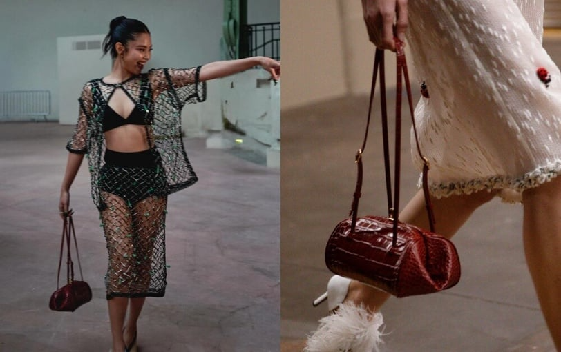 值得一提的是,Jennie 手上拎的包款同樣出自 CHANEL 同系列設計,磚紅色調與鱷魚壓紋皮外套完美呼應,讓整體造型更有一致性。今年在秀場上也能看到不少長柄手提包(long-handle bag) 的設計,小巧圓筒輪廓搭配細長提把,不僅帶有復古感,也成為本季時裝周相當熱門的包款趨勢。