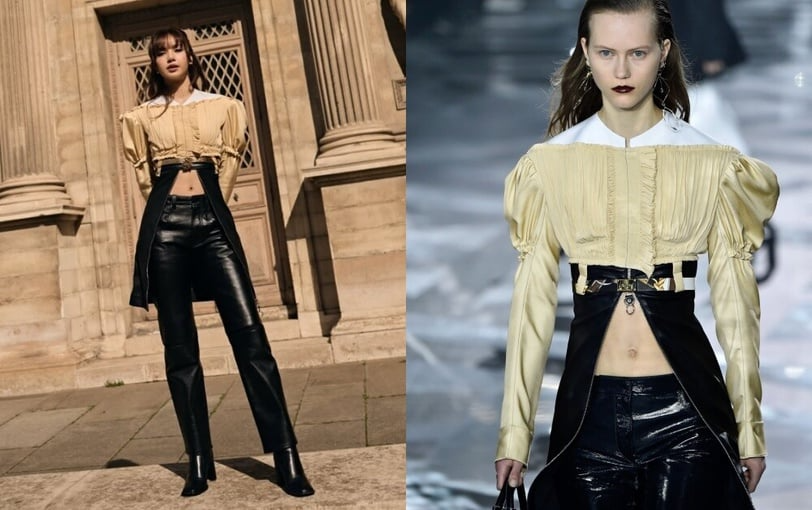 Lisa 這一套穿搭就相當有巧思!只見她捨棄新品不穿,改上身十年前 2016 秋冬系列的 Louis Vuitton 秀款,用疊穿假兩件的方式分割了上下半身,還把原來秀款皮帶換成一金一黑,褶皺泡泡袖與皮褲形程強烈視覺對比,既像公主又像帥氣騎士,看點滿滿。