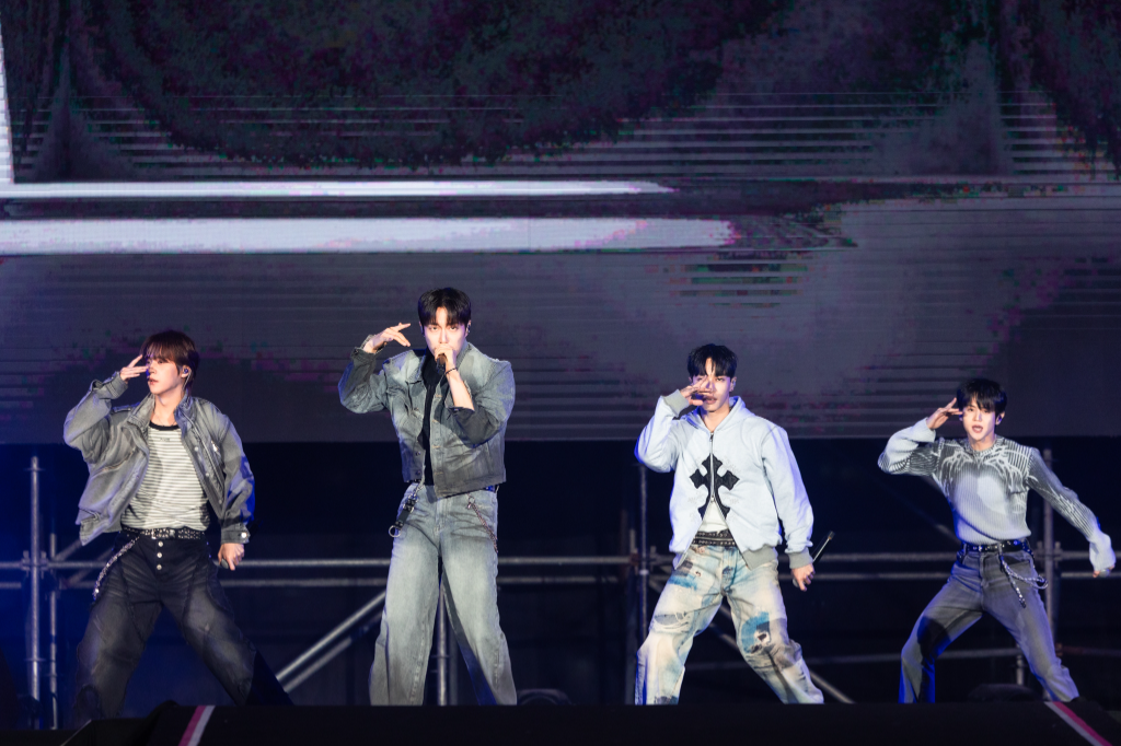 演出一開場,HIGHLIGHT 便以節奏強烈的〈Chains〉揭開序幕,俐落舞步搭配成熟舞台魅力瞬間點燃氣氛,他們想起上次來高雄是在2024年的演唱會,當時高雄LIGHT的熱情現在還記憶猶新。接著帶來〈On Rainy Days〉、〈Fiction〉、〈Shock〉三首代表作,熟悉旋律一響起,全場立刻變成大型 K-POP 合唱現場,歌迷跟著大聲合唱,氣氛熱烈。演出後半段再接連帶來〈BODY〉與輕快節奏的〈Plz Don’t Be