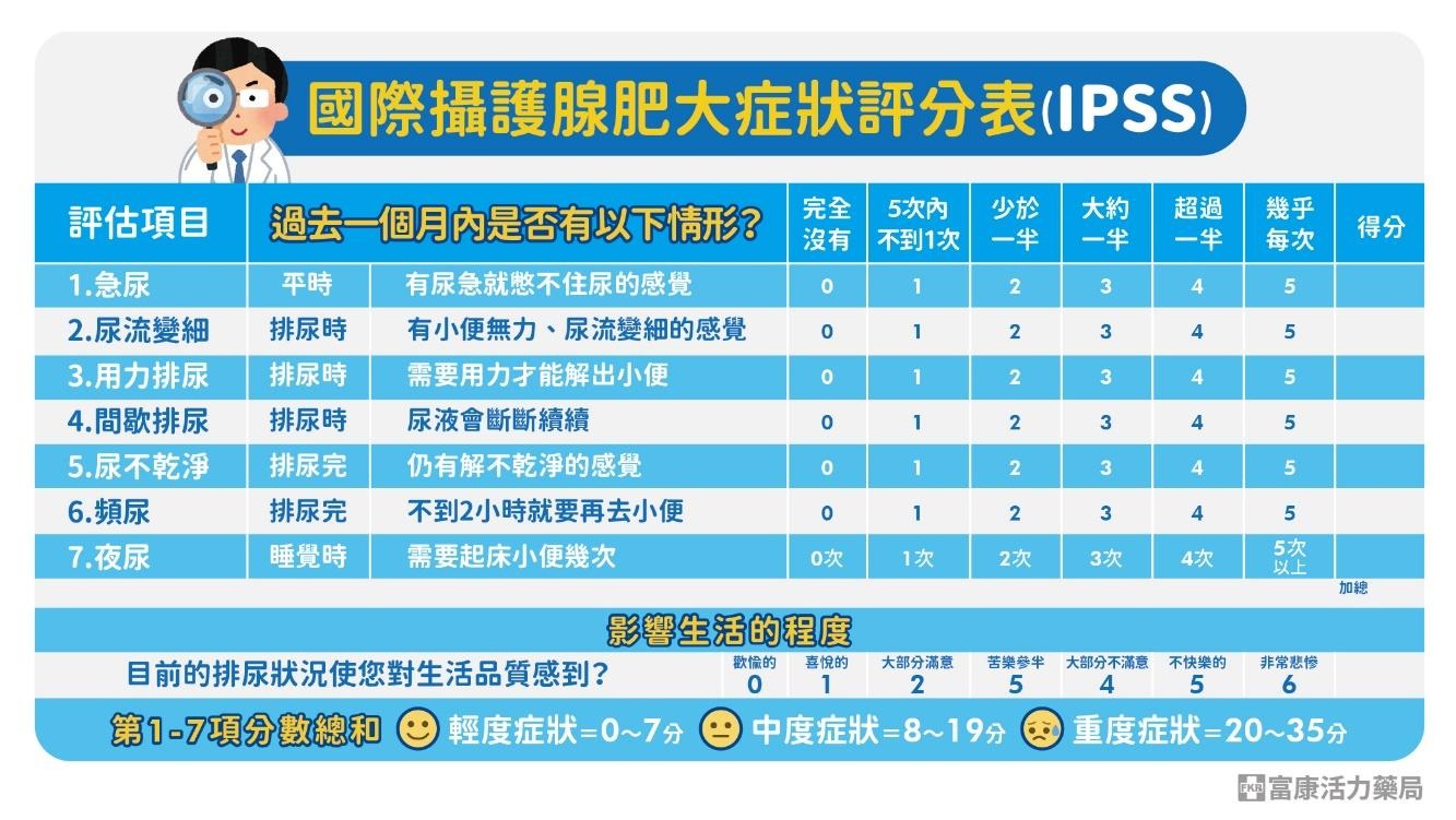 若想先初步掌握嚴重度,臨床上常用IPSS(國際攝護腺症狀評分表)協助評估症狀對生活的影響。不過,量表可以作為參考,不能取代醫師診斷;若分數偏高或已明顯影響睡眠、工作與外出安排,仍建議進一步至泌尿科檢查。