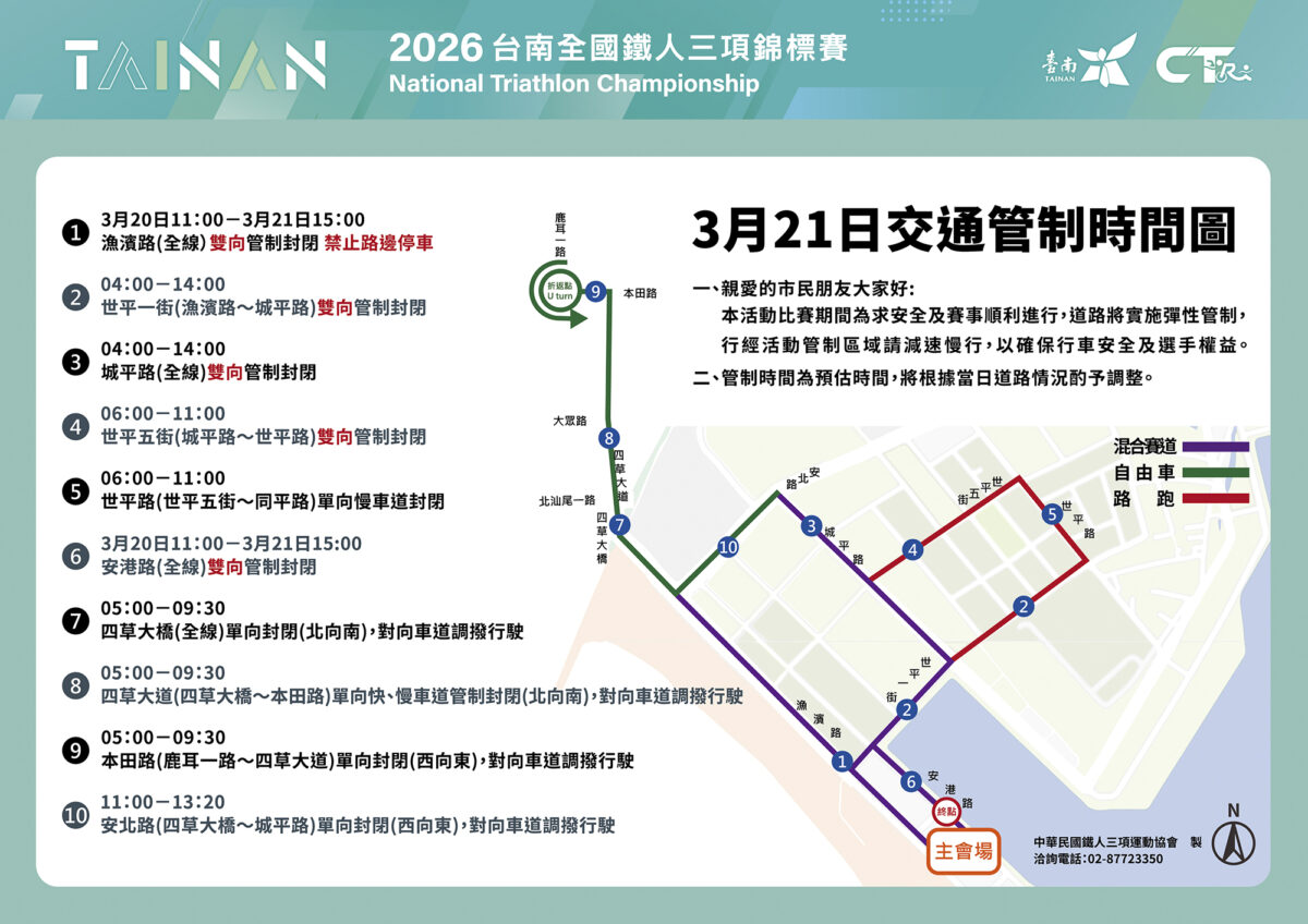 【記者 劉秋菊/台南 報導】2026臺南國際鐵人三項錦標賽將於3月21日(星期六)於安平觀夕平臺海域及周邊道路盛大登場,賽事結合游泳、自由車及路跑三項運動,吸引全國鐵人好手齊聚臺南挑戰自我。本次賽事於安平觀夕平台、臺江國家公園周邊及安平、安南區部分道路舉行,為確保選手競賽安全與活動順利進行,屆時將實施交通管制,提醒用路人提早改道。