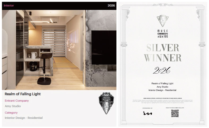 美國 MUSE Design Awards致力於發掘全球設計繆思,涵蓋建築、室內、時尚等領域。2026年共吸引來自124國、超過十萬件作品參賽,由200多位專業評審嚴格遴選,為國際設計界的重要指標。在作為設計師自用示範宅兼辦事處的《光落之境》中,艾美幸福設計 設計總監 許捷甯