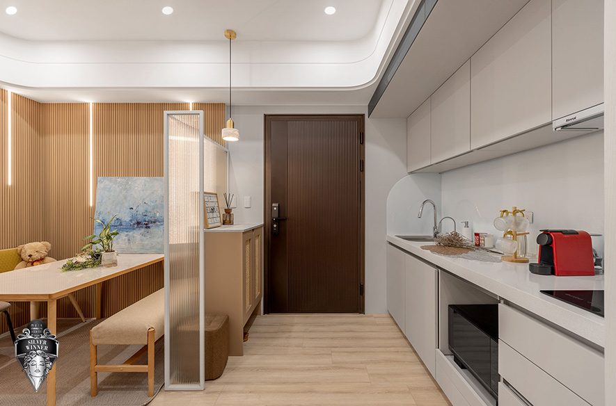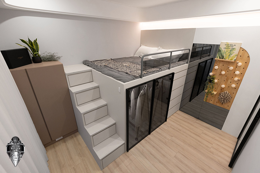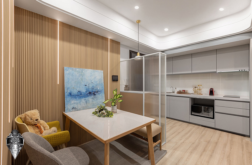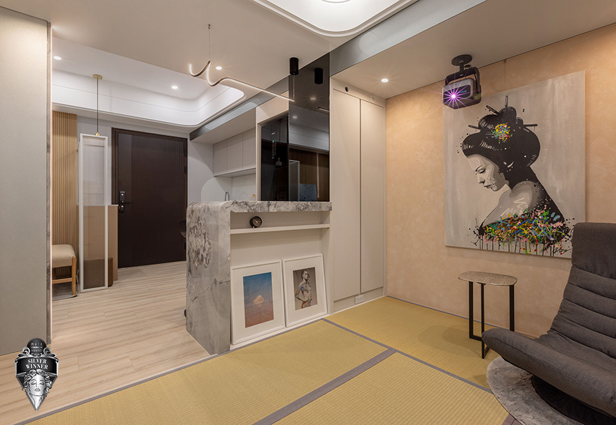 活用大面積長虹玻璃、鏡面及大理石等建材,透過其反射特性延展空間縱深感,配合搭載多樣彈性功能的吧檯、榻榻米區,以實際作品達至宣傳品牌可將小宅化作視野開闊、機能充沛場域的效果;貼合示範宅和辦事處定位的匠心設計,亦緊扣賽事著重創新巧思的核心理念,成功贏得「銀獎」佳績!
