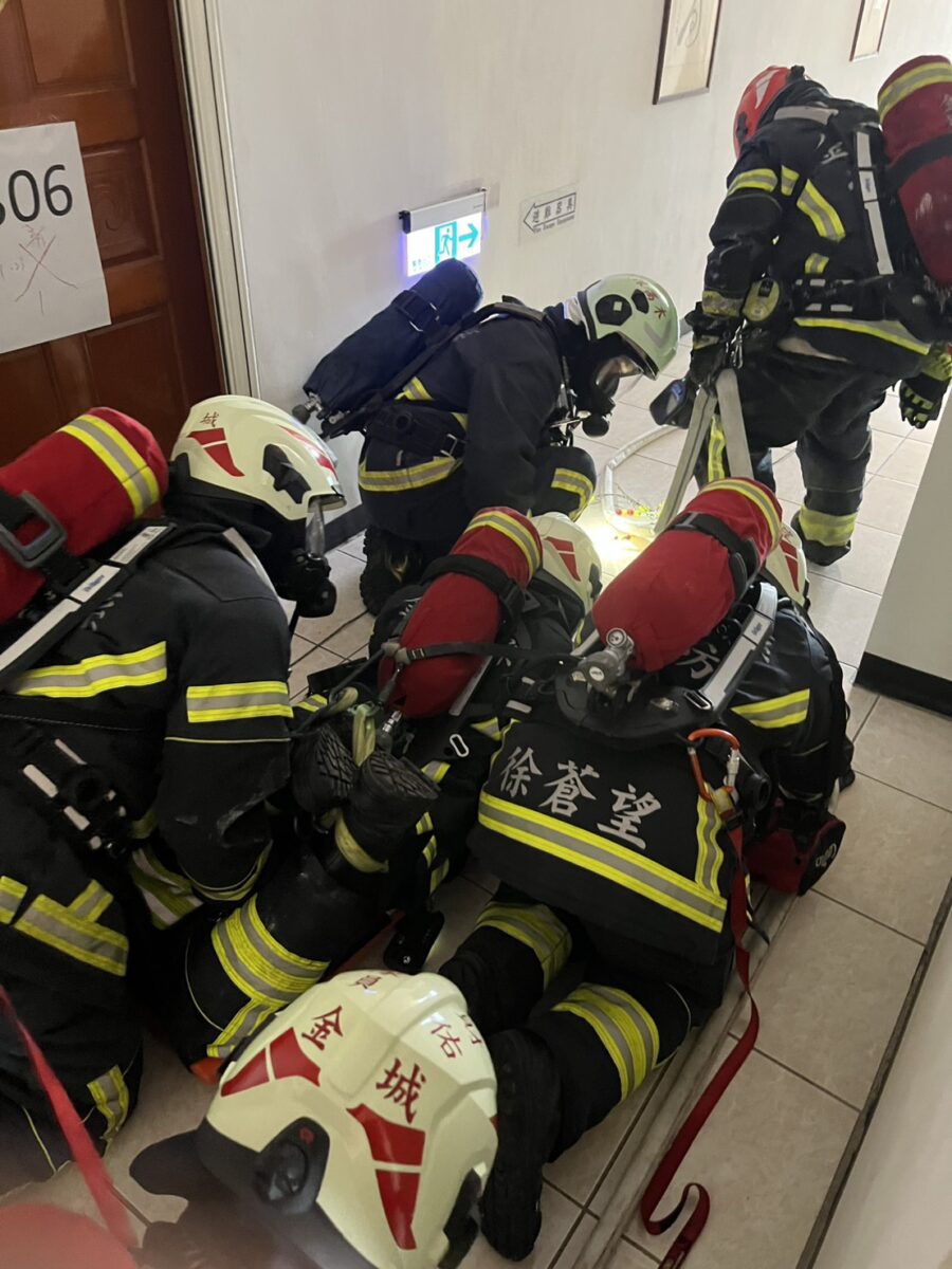 烈嶼分隊地處獨立作戰區,即便在大橋通橋的情況下,於本島支援力量抵達前這段「初期救災空白期」考驗著烈嶼分隊第一時間的指揮調度能力。現場指揮官必須在支援未到前,針對搶救部署做出最精簡且高效的決策。本次演練模擬旅館3樓電機房起火,大量濃煙瞬間充斥走廊,2名旅客受困於房內。演練納入近期金門民宅火警的成功案例–受困民眾因「發現濃煙立即關門」而獲救的經驗,將此策略轉化為演練重點。演習過程中,消防局指揮中心(119)啟動「三方聯繫機制」,同時與受困旅客、現場指揮官保持通話,除了第一時間引導旅客就地避難,更迅速掌握受困人數與精確位置,協助入室搜救小組縮短搜索路徑,體現了「精準指揮、正確避難」的救災戰術。為強化臨場感,演練特別設置「情境官」角色,隨機下達大門深鎖需破門、救災水帶不足,甚至是消防同仁遭重物壓困等突發狀況,逼出參演人員的壓力底線,並同步啟動「緊急救援小組(RIT)」進行消防人員救助。另為提升搶救成效,避免消防人員承受過度工作負荷,亦加入災害現場「R.E.H.A.B後勤照護」演練,以建立完善救災輪替機制,因應日益複雜的救災型態。