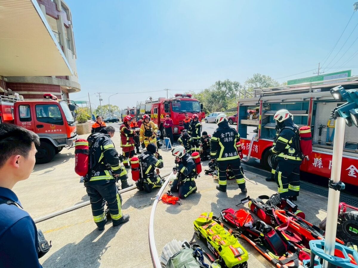 【記者 洪美滿/金門 報導】隨著金門大橋開通帶動產業轉型,小金門地區民宿與旅館產業蓬勃發展,然而旅館建築構造複雜、人流密集,火災風險遠高於一般建物。為因應旅遊旺季的消防安全,消防局日前於烈嶼轄內辦理「旅館實戰化火災搶救演練」,總計動員第一大隊、烈嶼、金城及金寧分隊共 9 輛消防車、19 名職義消參演,模擬高壓情境下的跨海支援與人命搜救任務。