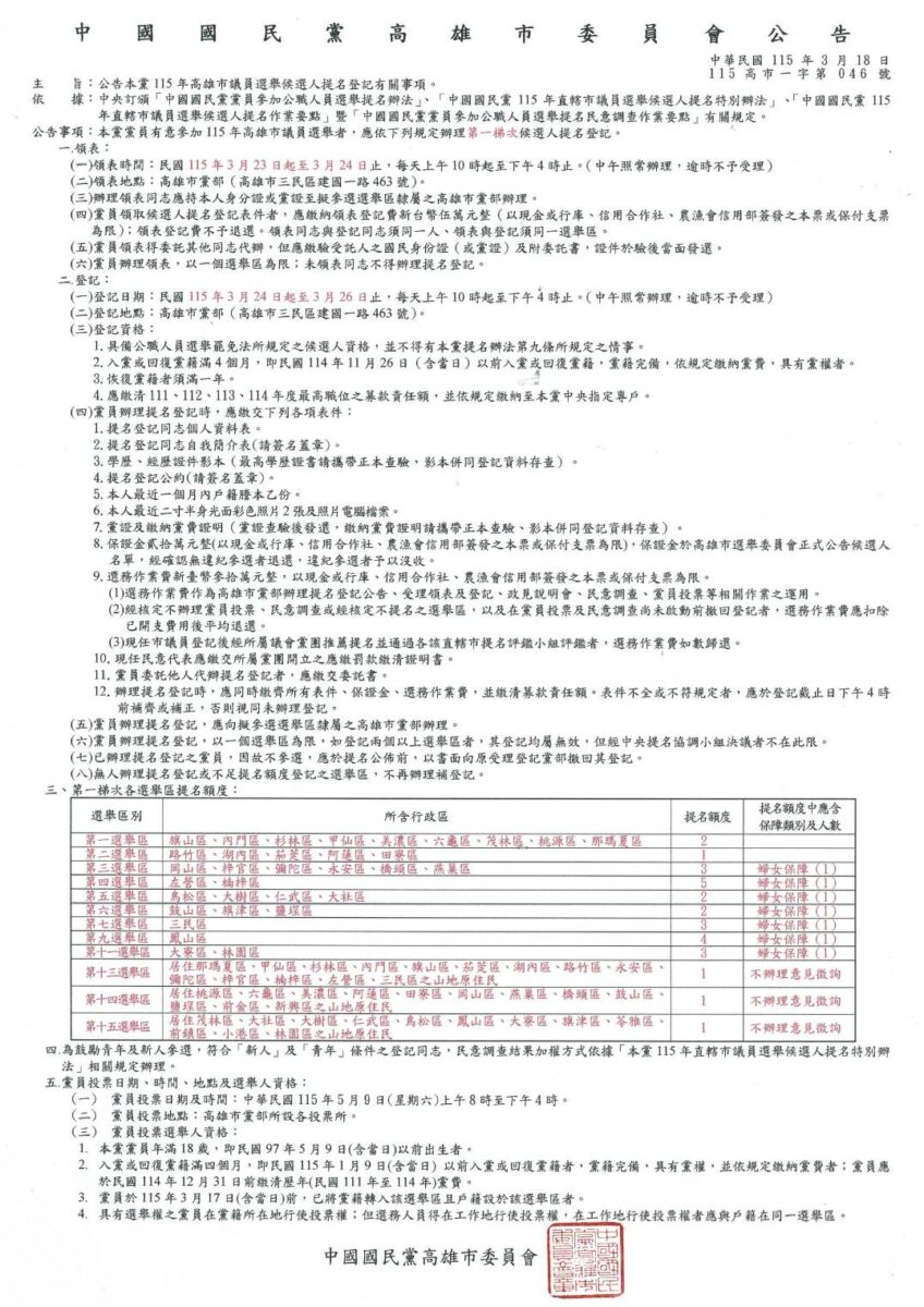 國民黨高雄市黨部公告115年高雄市議員選舉提名登記有關事項