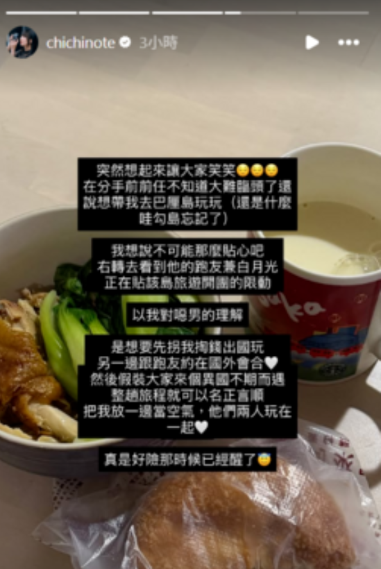 織織在Instagram限時動態透露,當時賴賴主動提議帶她到海島旅遊,但以她對對方過往行為的了解,直覺「不可能那麼貼心」,於是立刻查看對方一名「跑友兼白月光」的社群動態,竟發現該女子也正好發布同一地點的旅遊開團資訊,讓她瞬間看穿整個安排。