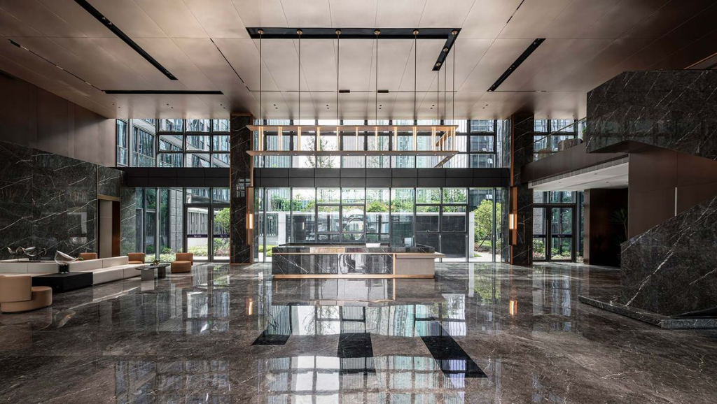從空間語彙的角度來看,嘉合公寓在造型上採用了大量的豎向線條與圍合場域,象徵著建築「摩天」的現代性,也象徵著人在城市裡不斷追求上升的精神狀態。走入公寓公共空間,從挑高大堂、垂直燈飾、藝術裝置,到壁面、傢俱線條,無一不是往上延伸的設計語言。這些設計不僅在視覺上創造延展,也營造了一種精神性的「場」,讓人感受到空間中的莊重與秩序感。