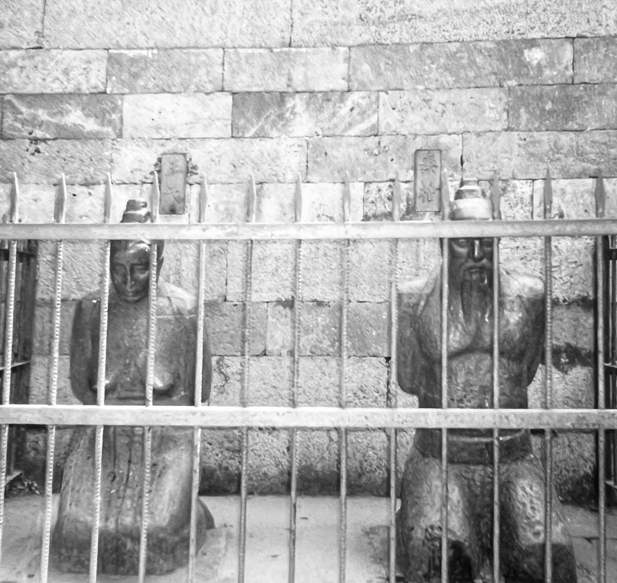 ▲作者和友人在杭州宋岳鄂王墓前留影 ▼岳鄂王墓前奸相秦檜夫婦等鐵鑄謝罪跪像