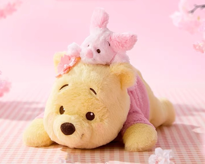 ▲ MINISO南紡正櫃首波主打系列之一「櫻花祭維尼趴姿公仔」,維尼與小豬舒適柔順的絨毛外觀可愛滿點,引爆粉絲收藏熱潮。(圖:MINISO)