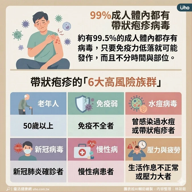 帶狀疱疹雖不會致命,但超過半數會在痊癒後留下長期「疹後神經痛」的後遺症。美國研究指出,約有99.5%的成人體內都存有病毒,只要免疫力低落就可能發作,而且不分時間與部位。