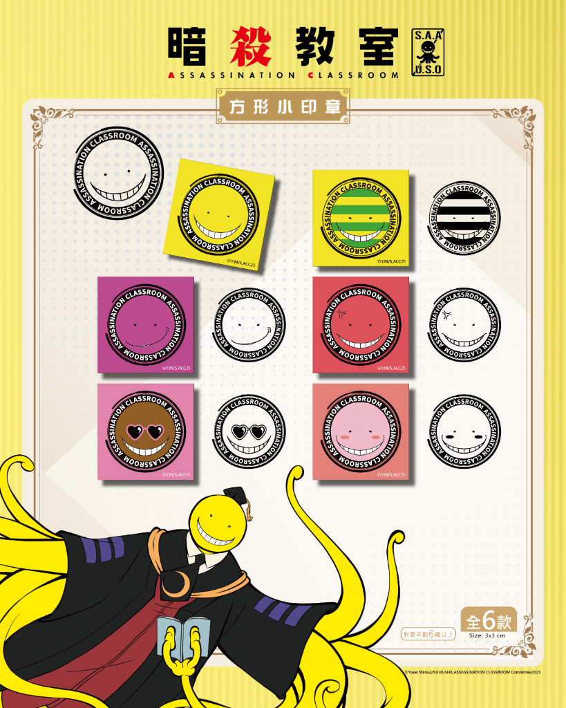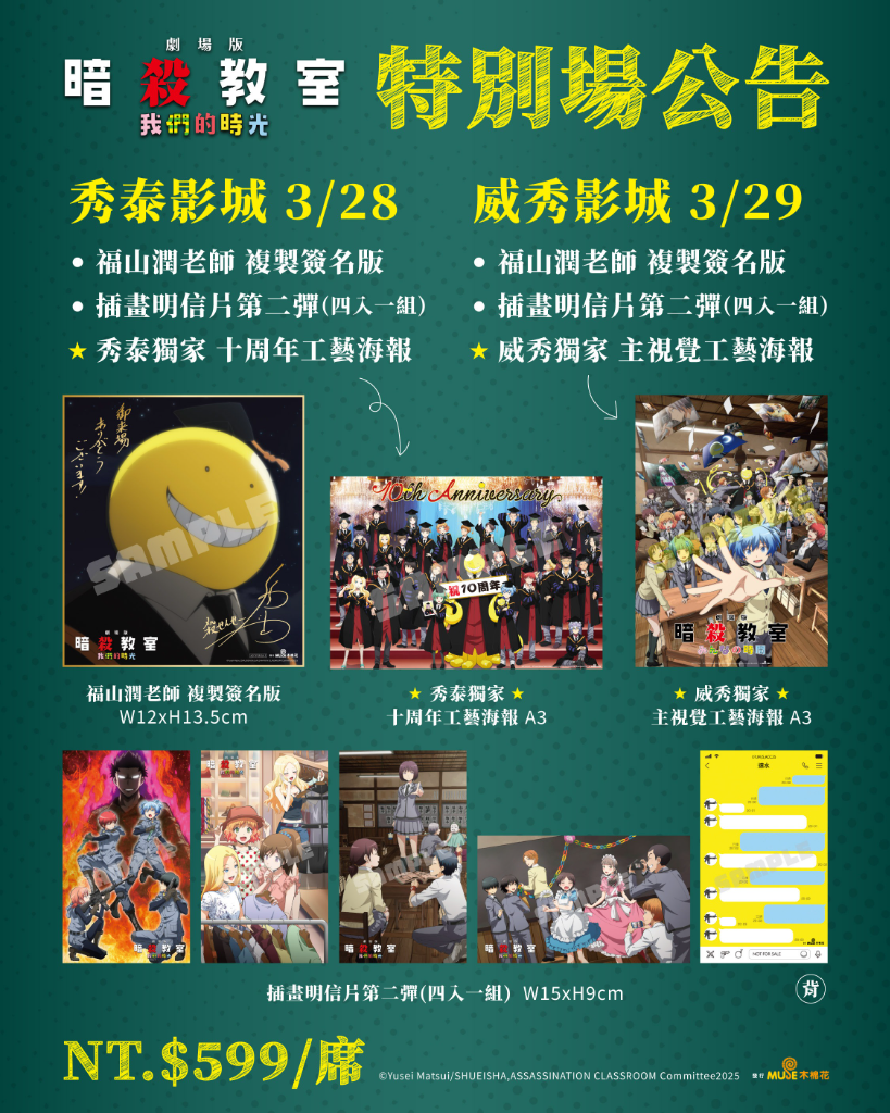 設計,三款採隨機贈送一款的方式,於 3 月 27 日至 4 月 2 日期間,購買《劇場版「暗殺教室」:我們的時光》電影票乙張,即可至原購票影城兌換特典乙份,數量有限,送完為止。