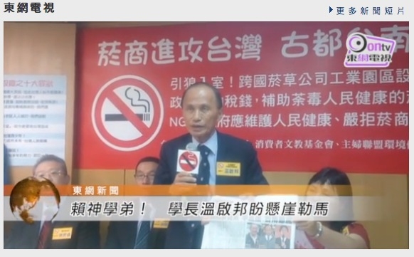【on.cc東網專訊】 台南市長賴清德有意核准跨國菸草公司傑太日菸投資新台幣92億元在工業園區設立年產值60億元的菸品加工廠 ,台灣醫界菸害防治聯盟發起人溫啟邦呼籲這位建國中學、台大醫學院、哈佛大學公衛系的學弟,趕緊懸崖勒馬,拿出良心,莫為蠅頭小利戕害台灣的下一代。