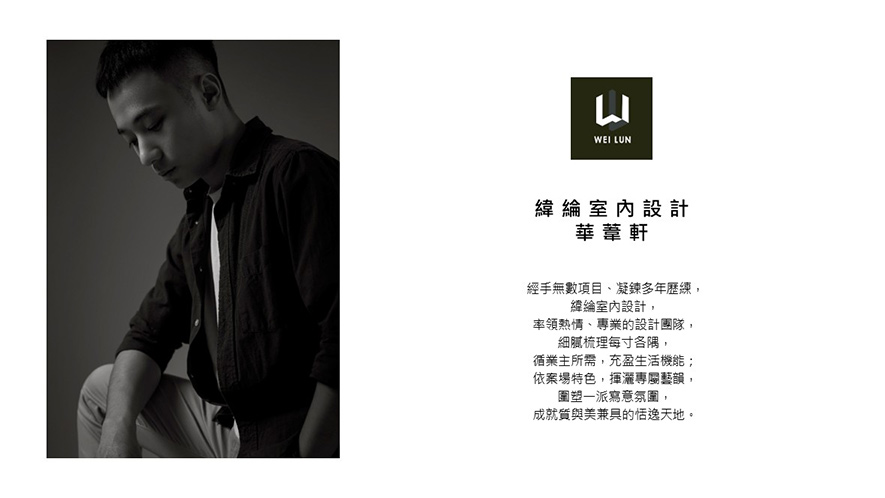 「好的設計不在複雜,在於好看、好用、好感受。」緯綸設計 設計總監 華葦軒 的核心理念看似簡潔俐落,實行之時,團隊中的每位設計師仍會抱持最嚴謹、認真的態度,面對所有客戶需求及案場細項,並掌握創意夢想和現實條件之間的平衡,實現一件件契合所需的精緻作品,將緯綸設計關懷業主感受的誠摯美學,一點一滴透過空間,遞予社會中更多人們溫馨暖意!