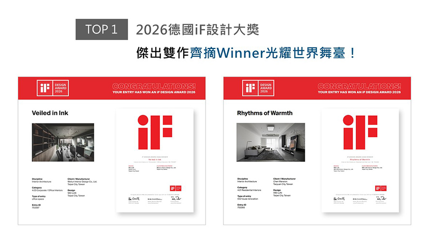 世界四大設計獎之一的德國 iF 設計大獎,在國際間擁有無可取代的指標性及前瞻性。本屆賽事,緯綸團隊精心挑選兩件作品報名參賽,《墨隱》跳脫辦公場所的制式,藉由整室沉靜暗調佐搭木紋、金屬異材,打造細膩精美的工作環境;另一件《暖序》運用匠心奠下的留白,輔以地坪及軟裝的淺灰層次,營造簡約舒心的居家氛圍。兩間精美創作一同贏得此次「Winner」大獎!