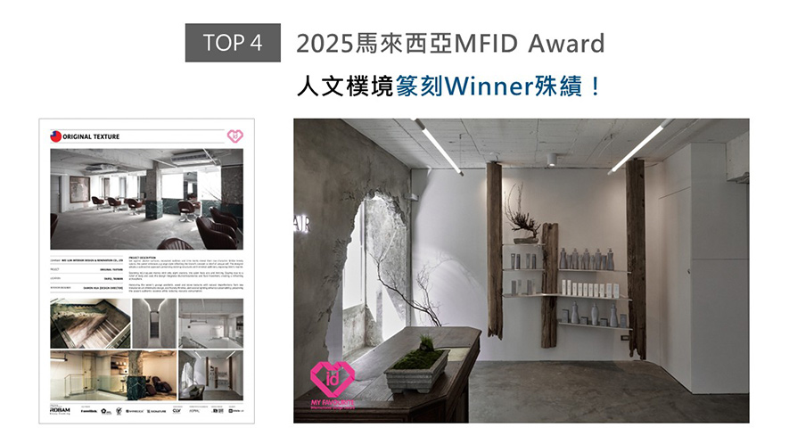 緯綸設計團隊呼應商空「釋放獨特自我」的品牌理念,採用減法設計精簡空間裝潢,並敲鑿原始建築的部分結構,形塑紀錄時光流逝般的質樸肌理,瀰漫頹廢藝術獨到美感的髮廊《Original Texture》,抱回2025 MFID商業空間類「Winner」大獎!