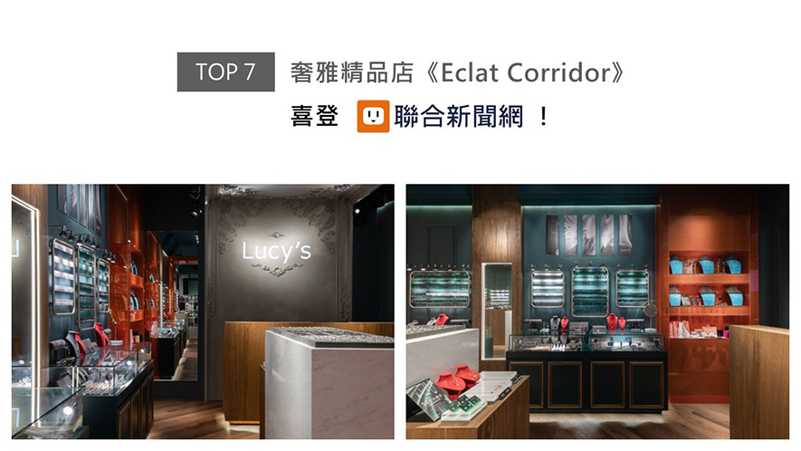 考量此案為飾品零售空間,華總監定「低調奢華」為主軸,融合歐式雕花天花板與現代精品陳列手法,佐以深藍綠、灰白主調,營造沉穩內斂的店面情境,間或綴入橘紅色彩描繪視覺亮點,令《Eclat Corridor》在繁華商圈的熱鬧街廓中脫穎而出,絕妙設計受聯合新聞網上刊支持!