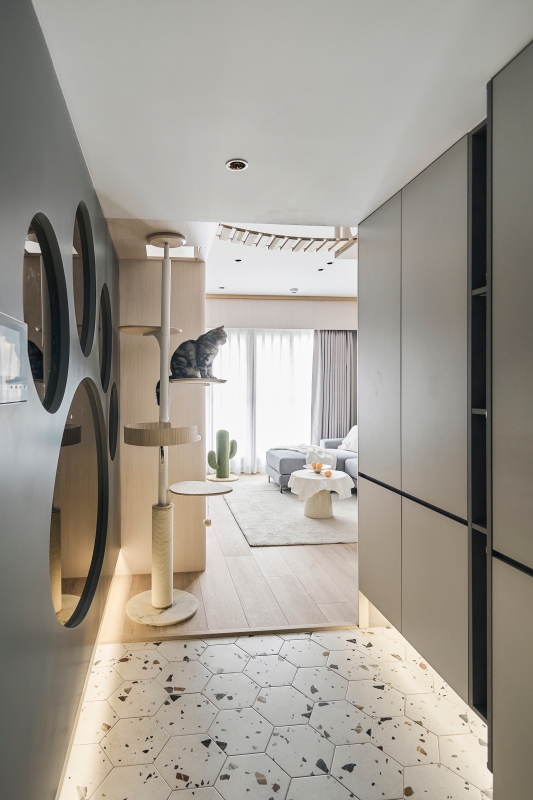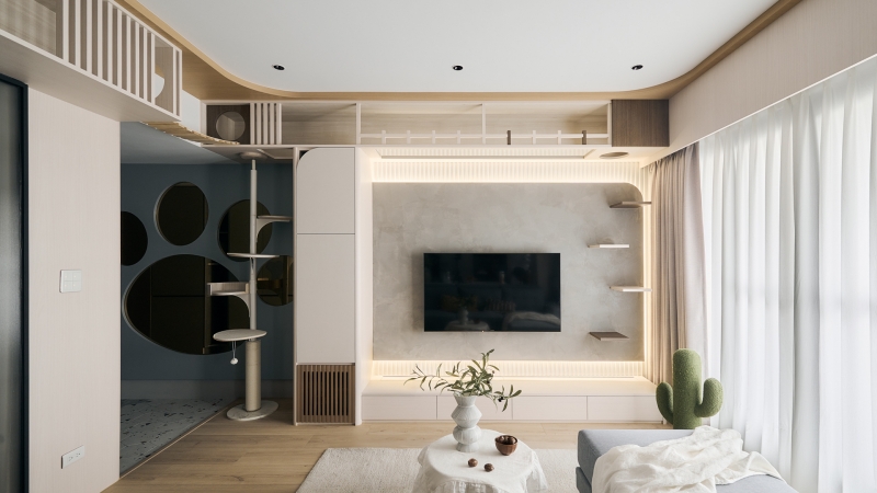 玄關以巨大貓掌印鏡面作為迎賓端景,在歸家時刻即與貓的存在產生對話。污衣櫃與鞋櫃以弧形修飾走廊尺度,落塵區鋪設水磨石六角磚,灰白撞色與流線排法引導步伐由外而內。客廳回應貓咪向上活動的天性,設有跳台與天空步道,採用木質與玻璃作為介面,光線得以穿透與反射,使立面表現更為輕盈。電視牆以沉穩特殊塗料結合圓弧,平衡視覺焦點;收納櫃體以淺色木紋為主,並設有上下開口確保設備散熱。