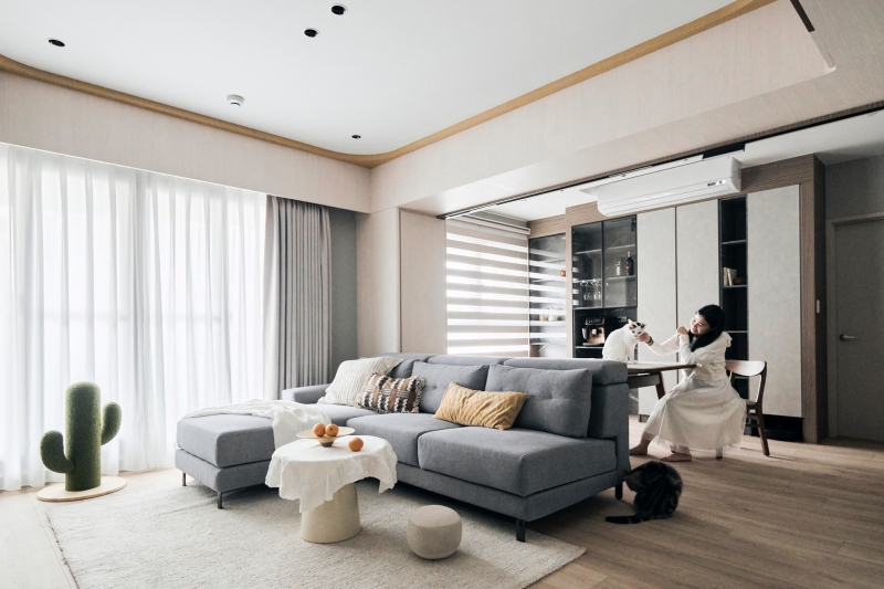 整體設計透過減房換取尺度彈性,以低彩度灰白與淺木色建立穩定背景,結合水磨石、木質等耐久材質,降低感官刺激並提升安全性,支持人與貓在共享的日常中長久陪伴。